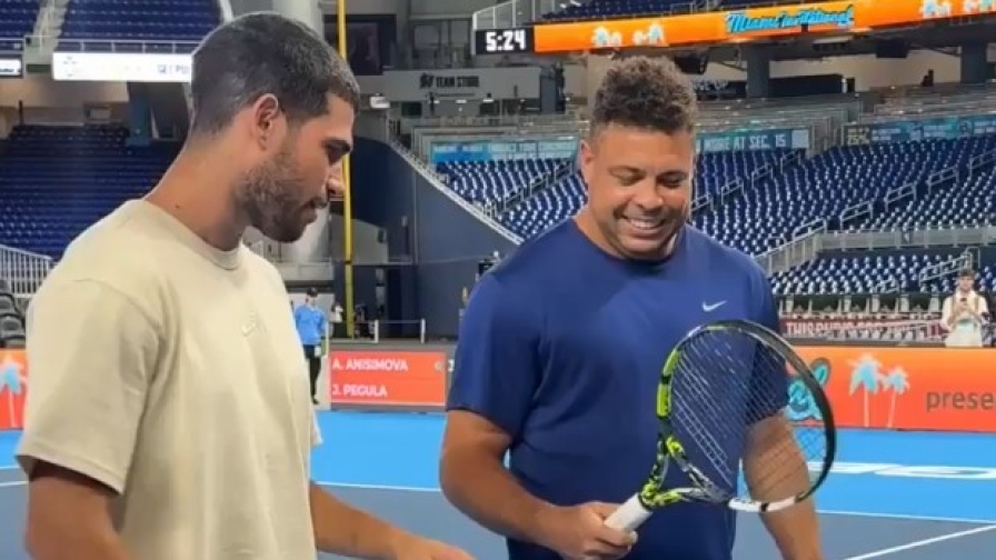 Durante l'esibizione di Miami, <a href="https://video.gazzetta.it/tennis/atp/highlights/video-alcaraz-tiafoe-spettacolo-e-tweener-nel-torneo-di-esibizione/cf176630-0833-4b03-9193-ea8435767xlk" target="_blank">Carlos Alcaraz</a> si concede un momento di svago nientepopodimeno che con Ronaldo Nazario, che dimostra buona tecnica sul campo....